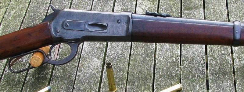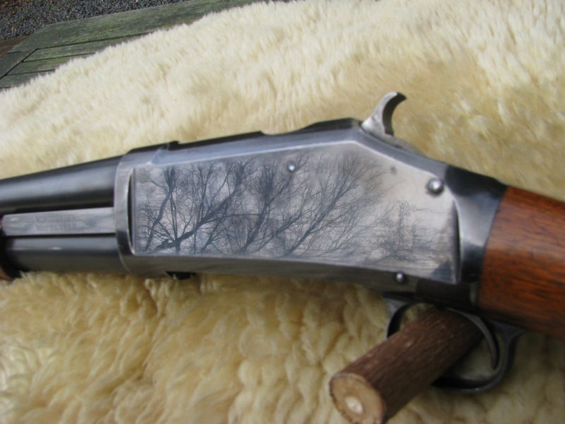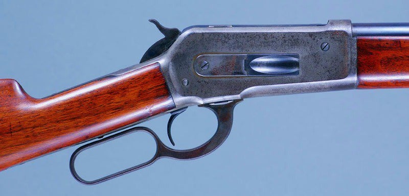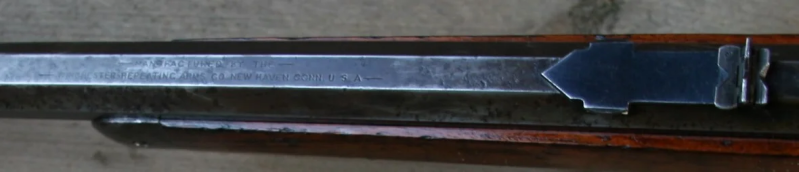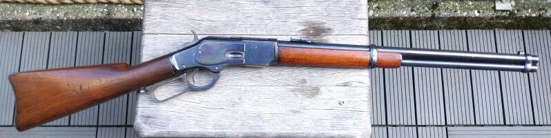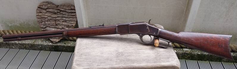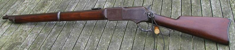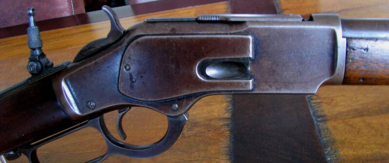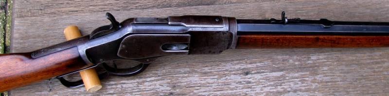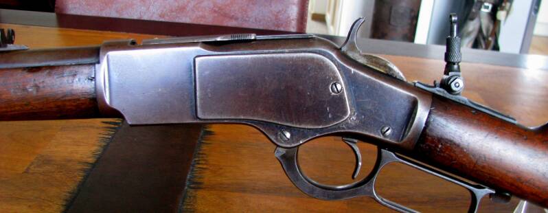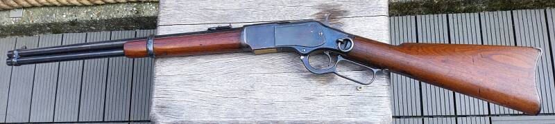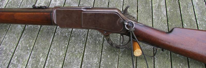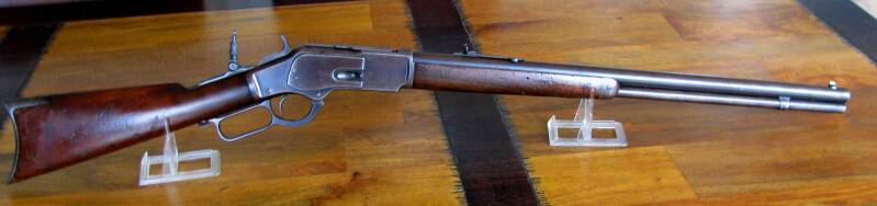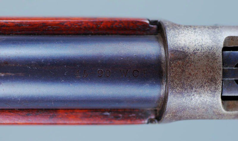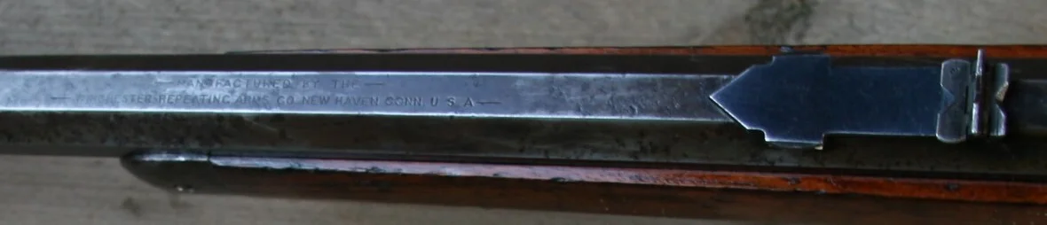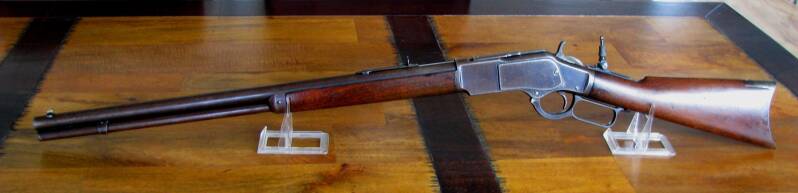 Manufactured in 1896. The rifle has a 26-inch octagonal, No. 1 barrel chambered for the 22 WCF cartridge. The barrel is fitted with a standard silver front sight and a Winchester standard full buckhorn rear sight.The barrel has the Winchester commercial blue finish and the "Thick-Side" receiver, breechblock, hammer and lever are color casehardened. The stock and forearm are straight grain American walnut. The stock has a casehardened steel shotgun buttplate, and the forearm has an ebony inlay at the tip. The barrel is roll-stamped with the legend: "-MANUFACTURED BY THE-/-WINCHESTER REPEATING ARMS CO. NEW HAVEN CONN. U.S.A.-" in two lines ahead of the rear sight. "22 W.C.F." is stamped on the top of the barrel immediately in front of the receiver. The lower tang is stamped: "PAT. OCT. 7TH 79" behind the trigger. The serial number, "751xx", is stamped in script numerals ahead of the rear tang screw.
