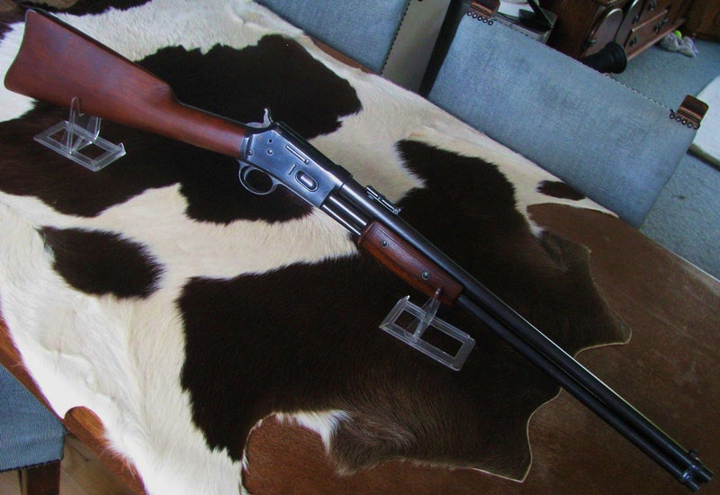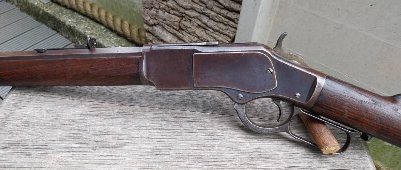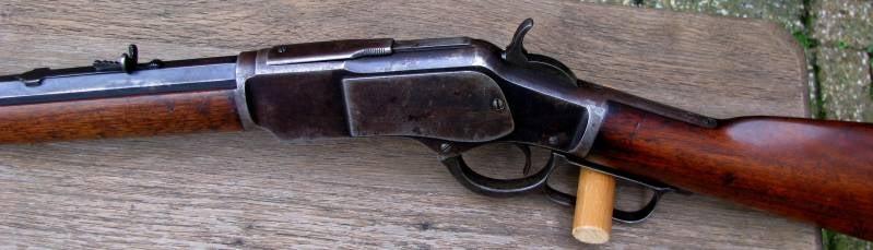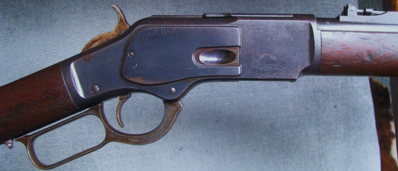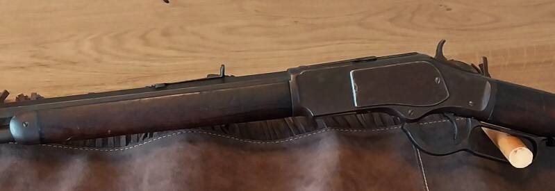 Deluxe Winchester Model 1873. .38 cal. 24 Inch barrel. Serial number 245xxx. Case colored frame has mostly silvered and or turned to a nice brown patina. There are only traces of bright case color in protected places on the frame but the hammer has some bright case color. Special options, Very good, Checkered, 4X Exhibition Grade Walnut Stocks shows honest use and carry wear. I see no evidence of sanding or cleaning, just honest use, with some jumps and dings in the wood. Checkered forearm and pistol grip. The barrel retains 30%-35% of the original blue finish that is mixing to a handsome and untouched chocolate patina. Has two more special options, “Rocky Mountain” front site and original "set trigger". Metal edges are crisp. Markings are all crisp and clear. The gun is a fine condition example of a deluxe that was carried and used but never abused. The bore is bright, shiny, crisply rifled with some light scattered spots and residue. Very good bore and much better than average for a Model 1873. The mechanics are nice and crisp. Very good + overall and really a nice old gun that shows nothing but honest use.