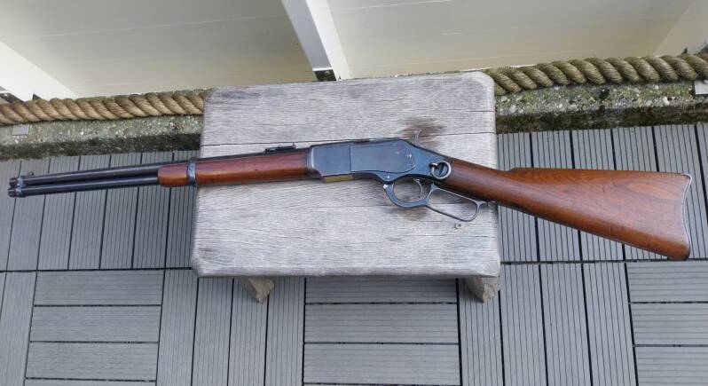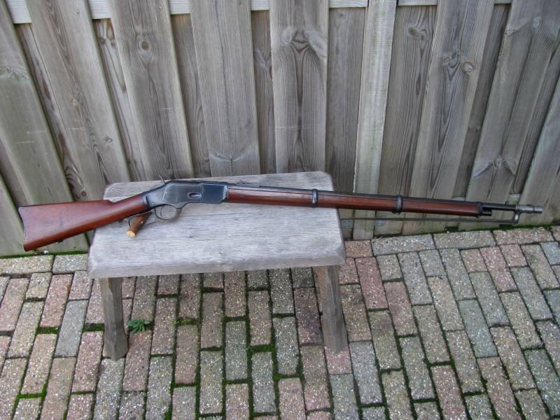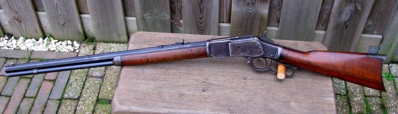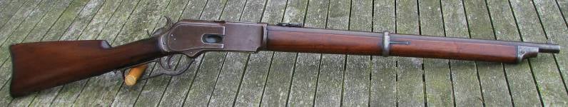 Outstanding Winchester 3rd Model 1873 musket in 44/40. Winchester Model 1873 Musket, .44-40 cal. lever action. Serial #371079B, mfg. 1891. with 30" round barrel, sling swivels, military sights, and semi-crescent buttplate. Excellent+ condition. Completely original Third Model Musket beauty that is a freeze-frame of the turn of the century! Very, very hard to find an original 1873 with 98%+++ blue, case color on lever/buttplate and fire-blue loading gate. A very handsome piece! Only 5% of the Model 1873's production was muskets and most of these were sent to foreign countries (Spain, France, Turkey, China, Japan, Australia, South American, etc.) - never to return or were destroyed - so these muskets are quite scarce. 30" three-band musket barrel with a mirror bore - wonderful. Tight action. Stock has some marks as expected, but retains 99% of original finish. Shotgun type butt. Long 17-shot tubular magazine (high capacity was a reason for its military use - if only Custer had been equipped with these, history might have been changed). Flip-up rear ladder sight with fire-blue spring. Vivid barrel address and caliber designation.