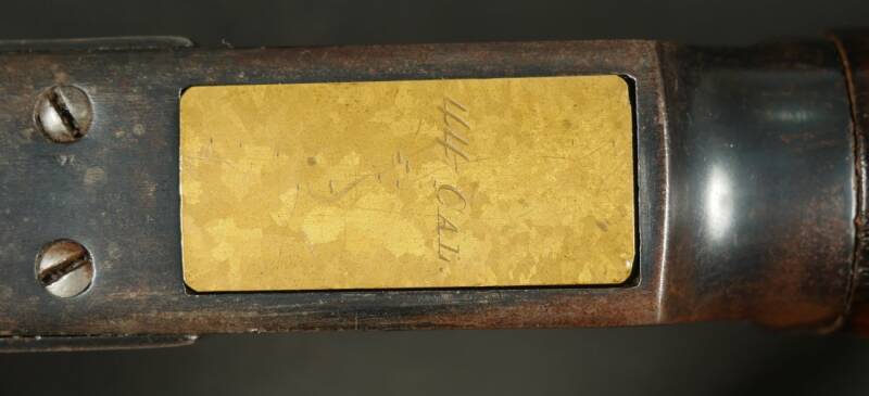 44 Henry RF. 20" round barrel. SN: 1250xx (mfg.1873). Silvered barrel and magazine tube. Many traces of silver plated on brass frame, buttplate, lever and hammer, fancy extra finish walnut stock and forehand. Lever action tubular magazine fed metallic cartridge repeating carbine. Carbine is mounted with the typical saddle ring in the frame secured by a U-shaped staple. Have the correct original non-adjustable leaf sight. The front sight is the standard blade found on the early carbine's front barrel band. Lever lock remains in place. A well used Third Model 1866 Saddle Ring Carbine with an uncommon silvered finish and lots of character in its overall appearance. Bore about good as well with strong visible rifling, good shine, moderate pitting and oxidation. Barrel markings remain mostly legible. Brass frame with strong traces of a tarnished period silver finish. Mechanically flowless and strong action.