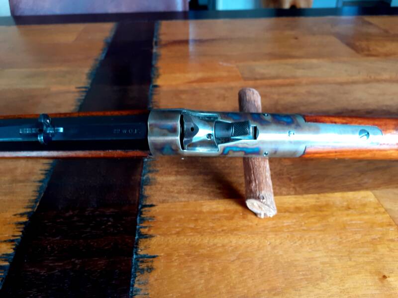 “Near mint”. The rifle is all original and retains more than 99% of the blue and color casehardened finish. The barrel has all of the original blue finish. The buttplate has a bout 75% of the casehardened finish. The receiver, breechblock and hammer have full case colors while the case colors on the lever show no handling wear and are darker and more muted. The stock is in very fine condition and has about 85% of the original finish with some litle handling marks. The excellent forearm has several insignificant handling marks. The sling swivels are very rare on a Model 1885 rifle chambered for the .22 WCF cartridge. Bore is like new and probaly never shot.