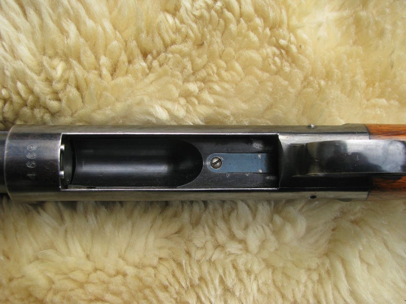 According to the Winchester factory report , this 1893 shotgun was shipped during first year of production bearing serial number 4669. The receiver retains at least 99% of the original factory high luster blue. The small parts like the carrier retain all of their original fire blue. The hammer has all of its original case color finish. The 1893 slide bar retains most of its original fire blue. The metal butt plate has at least 90% original blue. The wood is in near mint condition. The barrel retains at least 99% original finish starting to plum a bit and bore is mint and in unfired condition. It is in 12 ga. and the barrel is 20" with small set bead. It is one of the finest examples in existence.Given that many of the 1893 models were returned in 1897 when they were offered a new 1897 when trading in their 93 models, these guns are impossible to find and usually are beat to death. In either case, it is one heck of a cowboy shotgun and you never find a better one.