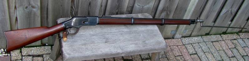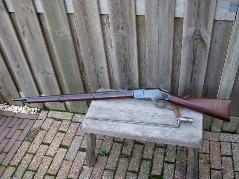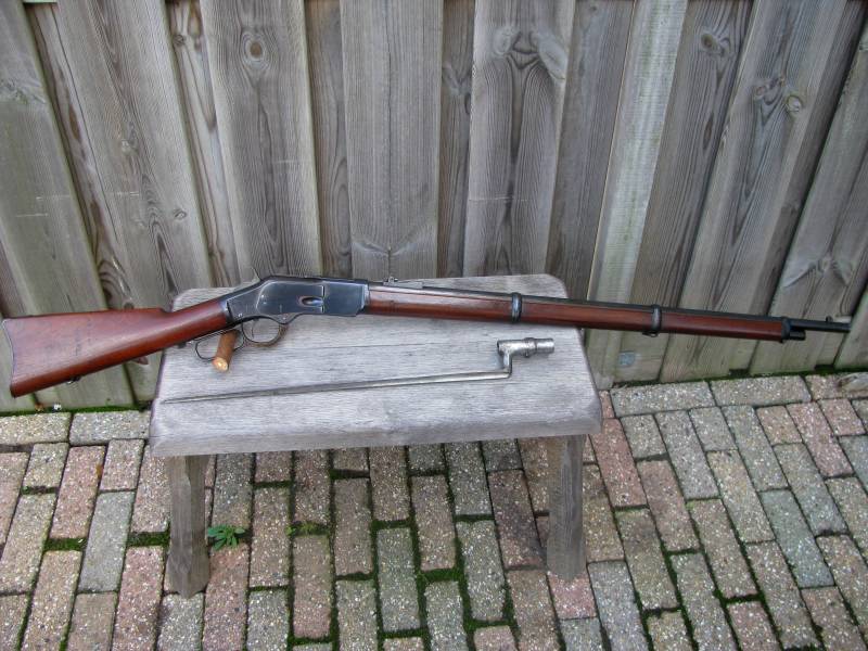 Outstanding Winchester 3rd Model 1873 musket in 44/40. Winchester Model 1873 Musket, .44-40 cal. lever action, with 30" round barrel, sling swivels, military sights, semi-crescent buttplate and with its original bayonet. All inNear Mint condition. Completely original Third Model Musket beauty that is a freeze-frame of the turn of the century! Very, very hard to find an original 1873 with 99,9%+++ blue, case color on lever/buttplate and fire-blue loading gate. A very handsome piece! Only 5% of the Model 1873's production was muskets and most of these were sent to foreign countries (Spain, France, Turkey, China, Japan, Australia, South American, etc.) - never to return or were destroyed - so these muskets are quite scarce. 30" three-band musket barrel with a mirror bore - wonderful. Tight action. Stock has some marks as expected, but retains 99% of original finish. Shotgun type butt. Long 17-shot tubular magazine (high capacity was a reason for its military use - if only Custer had been equipped with these, history might have been changed). Flip-up rear ladder sight with fire-blue spring. Vivid barrel address and caliber designation.