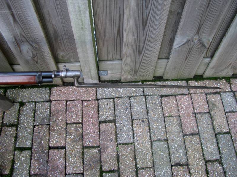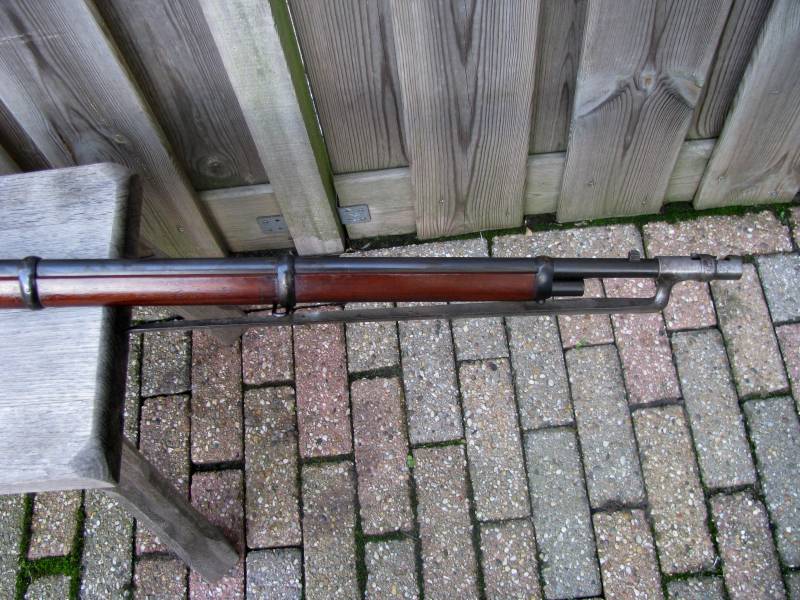 Overall condition is NRA Antique Excellent+ and appears to be still be unfired. The bore is mint and the bolt (including the face) still retains nearly all of its original blue. The action and mechanics are just like new. The frame has 98% bright shiny blue with some brown freckling from poor storage and a few scratches...typical of military handling. Loading port still shows 98% bright vivid fire blue. The hammer still shows 95% bright vivid case colors while the lever has about 90% case colors. Incredibly, the buttplate even has 95% original case colors remaining. Barrel has 98% bright original blue with some freckles from storage. Bands have most of their original blue intact with some light pitting on the outer edges of the rear band. Excellent screws overall...many look like they've never seen a screwdriver. The wood is in Excellent+ condition overall...completely untouched with no chips, cracks, or repairs and perfect wood to metal fit. Like most military weapons, it has lots of little nicks and bruises from being stacked in a pile. Very crisp sharp edges and contours on the wood showing almost no handling wear...just neglect. Most of the pre-1898's got used pretty hard in far-off lands which is why its so difficult to find nice antique ones.