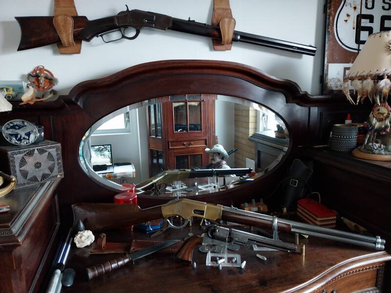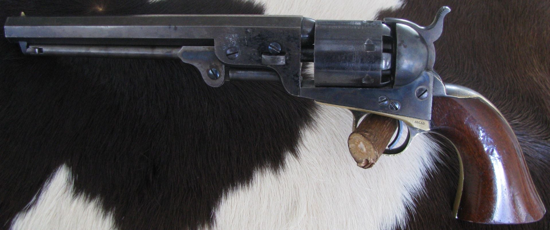 The silver plating on the brass grip frames of these Colts made in the 1860s wore off quickly, but this one still has some in the protected areas, now tarnished a bit. The brass has been left to age gracefully, and not polished, and that’s how I like to see them.