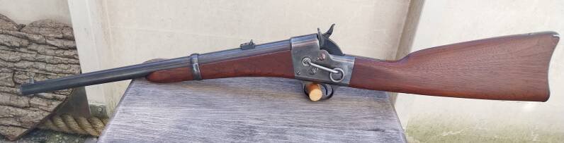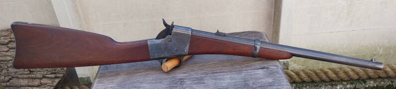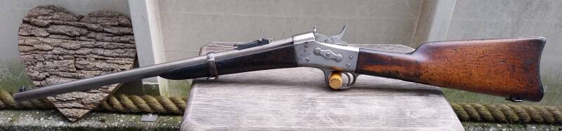 Remington Split Breech SRC 3rd Type. .50 cal RF. No Martial markings. 80% toned rainbow hues on the frame and band. The barrel retains 50% thinning blue with crisp markings, light overall use marks. The stocks show almost no marks and use marks. Overall very light use marks. Bright excellent bore near mint. Excellent stocks. Crisp mechanics.