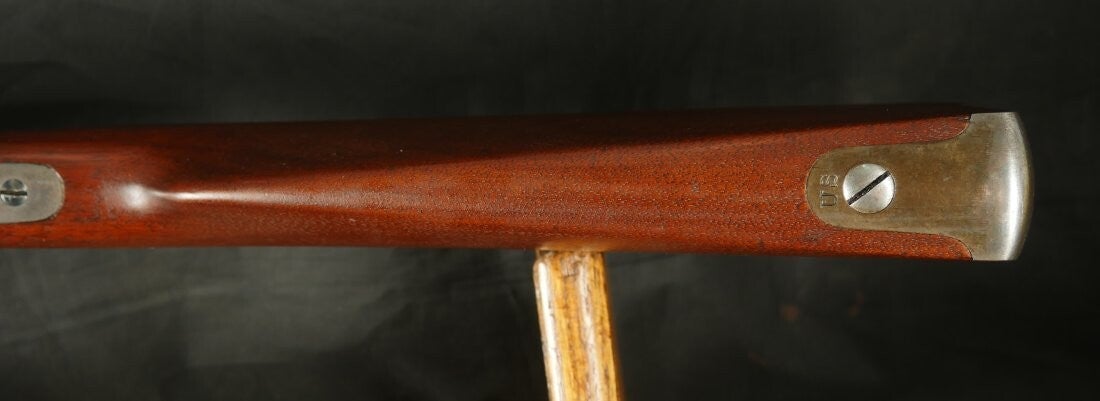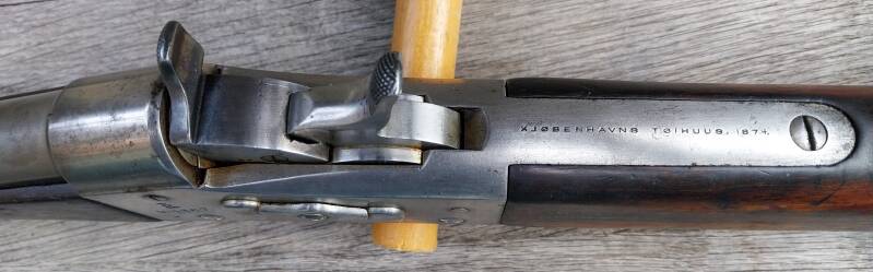 This is a very rare carbine in the United States and Europe. It is a rolling block carbine made in Denmark and very likely issued to the Danish navy. This is determined from research by noted military rolling block expert George Layman who writes on page 74 of his book Remington Rolling Block Military Rifles of the World: "When a rimfire "engineer" carbine is found, it is almost always because it belonged to the navy." This carbine is in .45-70 Cal. centerfire, making it a fine bird, indeed, as most Danish rifles and carbines were converted to centerfire in 1896. Denmark was the first foreign nation to contract with Remington to purchase and produce under license rolling block rifles for their military. It has an overall grey finish, which is common on these carbines (lots of polishing to keep ahead of salt air corrosion or issued in the white). Its 21" barrel has an excellent mirror bright bore. The copper disc in right side of buttstock is unstamped. The left side of receiver has the Danish crown over M-1867. The upper tang is marked KJOBENHAVEN TOIHOUS 1874. The wood is in very good condition with no cracks or chips. Danish crown stamps are clear, as is matching serial number on underside of stock and left side barrel. Sling Swivel near toe of buttstock, as it should be for a carbine. All in all, a very nice example of a Danish carbine rarely encountered in the United States and Europe.