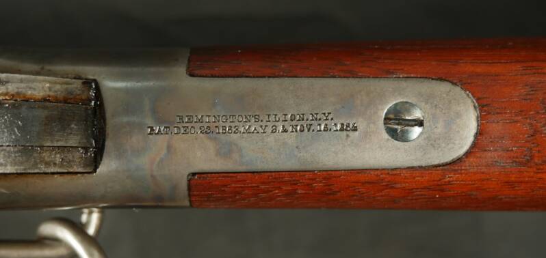 Type III "Split Breech" civilian carbines, such as this one as evidenced by its lack of an inspection cartouche on the stock, were part of the last batch of approximately 1,000 manufactured using leftover parts, dies, and machinery that was returned to E. Remington & Sons after the completion of the U.S. government contract deliveries by Savage Revolving Arms Co. on behalf of Remington. These were advertised in the catalog of 1866, with many sold and used out West. Thirty split breech civilian carbines like this example are known to have been purchased by Nelson Story Sr., who was a pioneer, Montana entrepreneur, cattle rancher, miner, vigilante, and a notable resident of Bozeman, Montana, just prior to his famous 1866 cattle drive from Texas to Montana along the Bozeman Trail with approximately 1,000 head of Texas Longhorns; the first major cattle drive from Texas into Montana. Features a pinched blade front sight, notch rear sight with folding leaf graduated to 500 yards, two-line Remington address and patent markings on the upper tang, and saddle bar with saddle ring on the left of the frame. Serial number most marked on the left front surface of the frame (not checket). "US" marked buttplate tang (leftover military contract part).