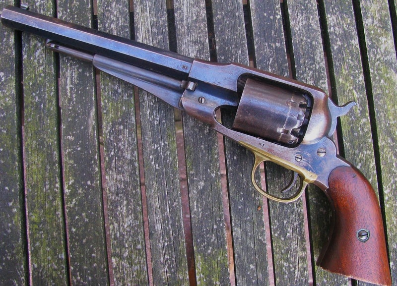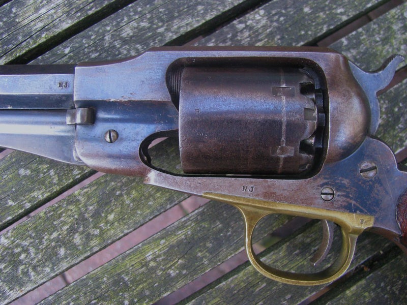 Procured in 1864 as part of a 1000 piece order placed August 8 of that year by the Quartermaster General of New Jersey, at a unit cost of $12.70. "N.J" is stamped on the left side of the barrel just ahead of the frame, "R W" on the outside face of the cylinder and the right side of the barrel and frame has “H H", and "B" on the left side of the trigger guard shoulder. The revolver has the standard, high-polish Remington blue finish with casehardened hammer and brass trigger guard. The serial number "64437" is located on the bottom of the barrel, the left side of the frame under the grips and on the inside of the grips. The top barrel flat has the standard Remington markings. 8” octagon barrel.