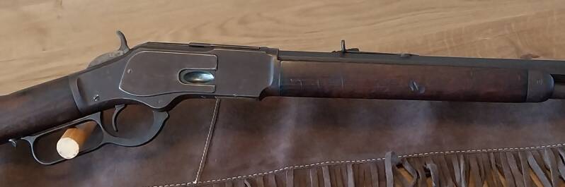 Overall condition is NRA Antique “very good” with 95% original receiver blue/brown patina. Barrel and magazine tube retain also 95% original blue/brown patina. Excellent markings throughout and sharp edges. Fine screws overall. Barrel have caliber markings which is correct. Very good wood overall with some normal use. Wood to metal fit is tight with all wood surfaces even to slight proud of the metal. Strong action and a good bore. This is a great midium late 1873 model. Honest and used cowboy gun.