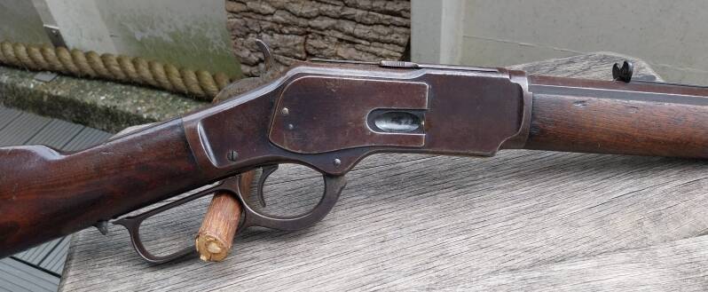 Winchester M-1873 Octagon Barrel Rifle in almost untouched condition. All surfaces are coated in heavy dark blue/brown patina. These guns have mostly been cleaned at some time and there are only a few rifles I have seen with such heavy patina. A gun with rich untouched patina like this is hard to find.