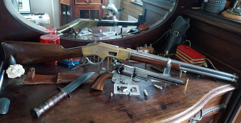 | With its lever operated repeating mechanism the Henry could be fired, the empty ejected, and a fresh round chambered without taking the rifle from the shoulder.  Its rival, the Spencer shot a more powerful cartridge and could be cycled at the shoulder, but the hammer had to be cocked each time before firing.  The greater magazine capacity of the Henry compensated for its weaker cartridge.     Capitalizing on the military success of the Henry, Winchester attempted to entice the military in several prototypes using systems after the end of the Civil War.  Tight military budgets and the adoption of conversion of the Springfield system to a single breech loading rifle for a more powerful centerfire cartridge, the 50-70, precluded any success for a military market for the lever action repeater. Winchester concentrated on the sporting market.     Beside the relatively weak .44 Henry rim fire, the Henry had two major disadvantages--a slit magazine tube (to accommodate the knob on the magazine follower) and a rather complicated loading mechanism.  The open magazine tube was vulnerable to debris and precluded a wooden forearm.  To load the Henry, the shooter had to run the follower up the magazine until the spiral spring was fully compressed against the housing mounted under the barrel in front of the magazine tube.  When the follower cleared the magazine the spring housing was rotated until the magazine was open to receive fresh cartridges which were loaded rim first into the tube.  The lip of the magazine captured the follower and compressed spring during loading. With the magazine charged, the housing was rotated into battery and the follower let down by hand on the loaded cartridges.  Winchester began modifying the basic Henry rifle to produce a new arm which retained the firepower capabilities of the Henry, but eliminated some of its problems.     Birth of the Yellow Boy     External Modifications      Utilizing the King patents and other innovations, Winchester placed a spring load gate on the right side plate of the Henry.  With the cartridge loading gate in the receiver the complicated magazine of the Henry was replaced with a closed end tube attached under the barrel.  A coil spring fed cartridges to the follower.  The closed magazine facilitated the addition of a forearm to the new system.     Internal Features      Initially, the basic toggle joint breech mechanism of the Henry was retained.  It worked and was not changed at first.  Some modifications to the breech system occurred later with some minor changes to the bolt.     Some Henry rifles were made with iron frames, but gun metal, a form of bronze about the same color as brass, was used almost exclusively after serious production began.  Easy to machine, gun metal was used exclusively in the frames of the new rifles. It was not long before the new Winchester was dubbed the “Yellow Boy.”  The rifle was an instant hit. Some 150,000 Yellow Boys were produced from 1867 to 1892-93.  Serial numbers began in the 13,000 range where the Henry left off.     During this period the company reorganized and changed its name from the Henry Repeating Arms Company, formerly the New Haven Arms Company, to the Winchester Repeating Arms Company. The new rifle was the first to bear the Winchester name.     The Yellow Boy was offered in rifle, carbine, or musket models.  Standard barrel length for the rifles was 24 inches; carbines, 20 inches; and muskets, 27 inches. Sights on the rifle were a blade front and ladder type rear similar to those used on the Henry. The rear sight for the carbine was shorter than the rifle in its long range configuration.     A number of factory engraved Yellow Boys with fancy wood were produced. Factory engraving is distinguished from after market embellishment by being ordered as such. While Winchester employed some in house engravers, orders were also “farmed out” to individual engravers.  At least one Model 1866 was made with a silver frame.     Peak production came shortly before the introduction of the Model 1873 Winchester.  The Yellow Boy enjoyed certain popularity in Central and South American countries.     It is hard to estimate how many of the original Yellow Boys exist.  With the Winchester collecting fever during the last half of the 20th century, most of them ended up in collections. Today, an original Model 1866 Winchester in fair shape is somewhat pricey.  Estimating the worth of one in good or excellent condition is speculative at best.           (foto; winchester 1866 Indian tacked on comb)       The .44 Henry Flat Rimfire Cartridge    Since the development of the new rife occurred during the developmental period of the center fire rifle cartridge, and no compatible center fire round was in existence, Winchester chambered it for the .44 Henry Flat round that had been proven in combat.  Loaded with about 28 grains of black powder behind a 200 grain flat nosed bullet, the .44 Henry Flat rimfire cartridge was hardly a big game number.  Muzzle velocity was about 1100 fps that gave it a bit more than 500 foot pounds of energy. This gave only about 30 pounds feet of momentum.  This would be about the punch as a comparably loaded .44 Smith and Wesson.  Near the end of the production of the Model 1866 Winchester developed a .44 Henry centerfire cartridge. Model 1866 Winchesters chambered for this cartridge are rare.  The .44 Henry Flat rimfire cartridge was loaded by ammunition companies into the 1930s.   Lying, crouching, kneeling or on horseback, the shooter could recharge the magazine of the 1886 Winchester from almost any position.  The dust and debris problems in the magazine of the Henry were largely eliminated in the new Winchester.  No dust covers were used on the 1866.  This did permit dust and other debris to enter the action, however, some shooters removed the dust covers on the Model 1873 Winchester.  They were easily dam